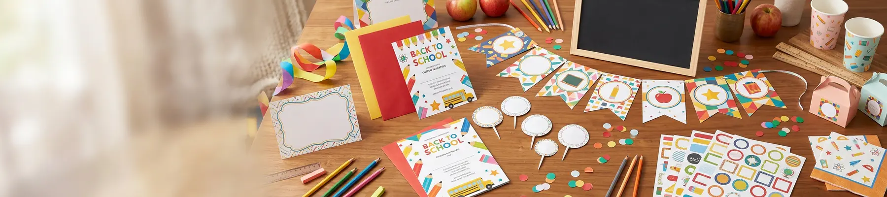 The collection includes banners, bookmarks, flyers, labels, and postcards - all designed for classroom, school event, and education marketing use. Each product comes in multiple sizes and paper options so you can match the right format to your specific need.
