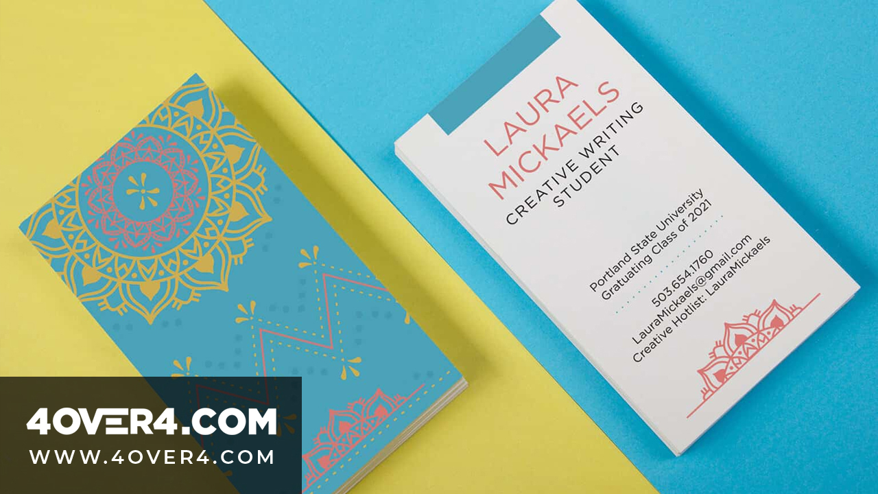 Order custom business cards online with 4OVER4 for assured print quality, unique print finishes, variety in premium paper stock and card stock, and printing. Highlight your personal brand and make a mark in your college by standing out among all. Our state-of-the-art business card printing machines and team of skilled people does complete justice to your professional cards. 4OVER4 customer service team is well adept in handling all your queries in timely manner and offer great assistance.