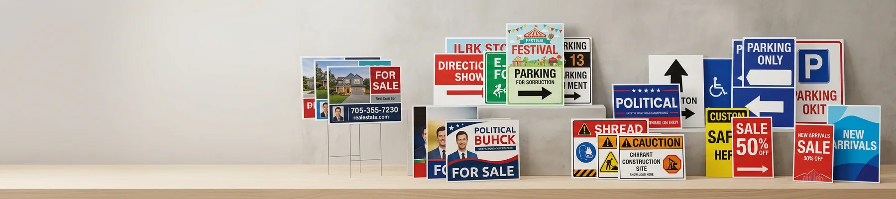 Standard coroplast signs use 4mm corrugated polypropylene with full-color digital printing. Premium options may include thicker material, UV-resistant coatings, or specialty finishes for extended outdoor life. Browse Showcase to see examples of both.