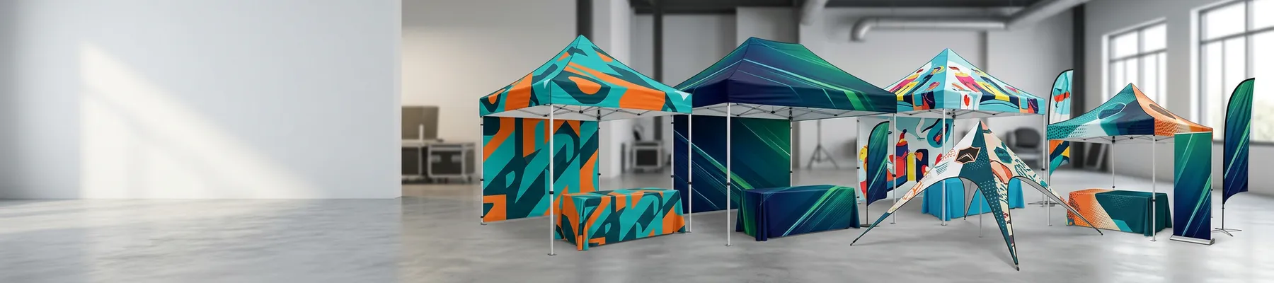 Event Tents are printed on durable polyester fabric using dye-sublimation technology. This process bonds ink directly into the fabric fibers, producing bright, fade-resistant graphics. The frames are typically lightweight aluminum for easy transport. The combination holds up well through repeated outdoor use.