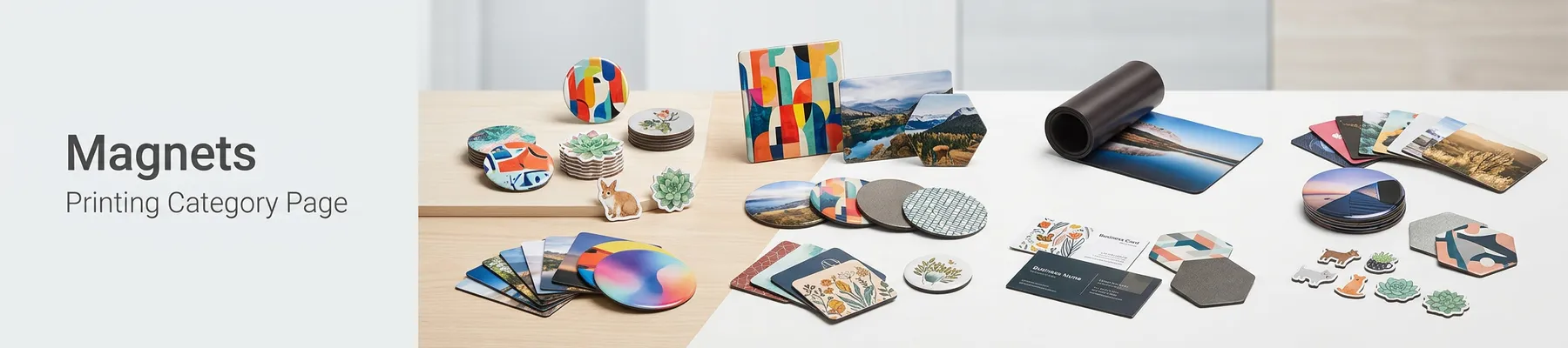Magnets are printed on durable magnetic stock with a smooth, printable surface. The material is designed for vivid full-color printing and strong adhesion. Different magnet products may offer varied thickness options - Dry Erase Magnets include a writable laminate layer on top.