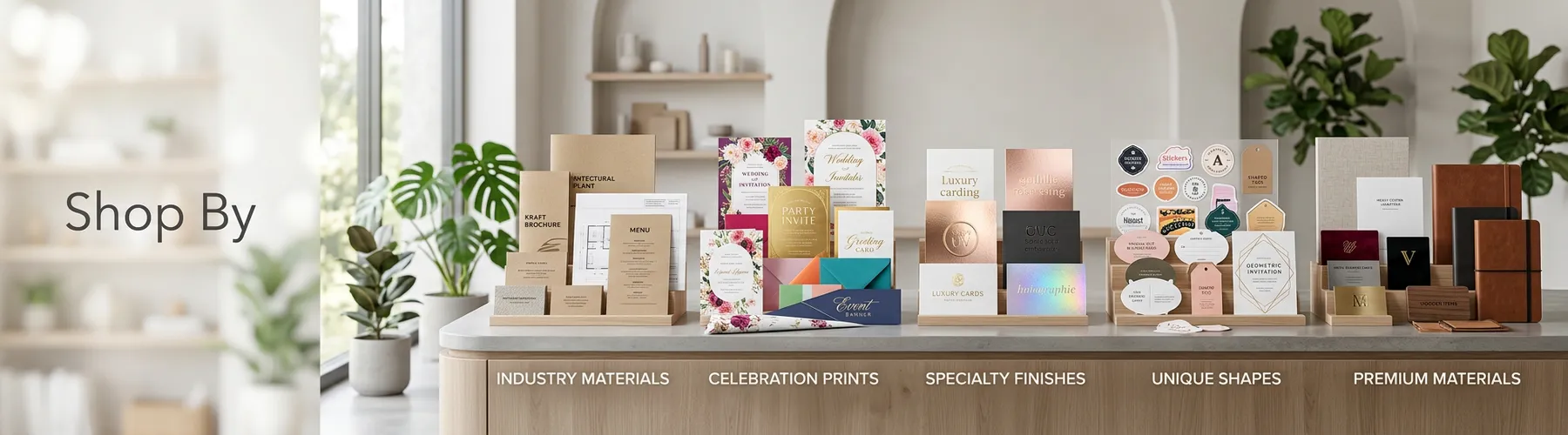 Start with your goal. If you want a specific look or feel, browse by finish or material. If you need products tailored to your profession - like real estate or restaurants - browse by industry. Event-based collections work best for weddings, holidays, and grand openings. You can also browse by shape if you want die-cut or non-standard formats.